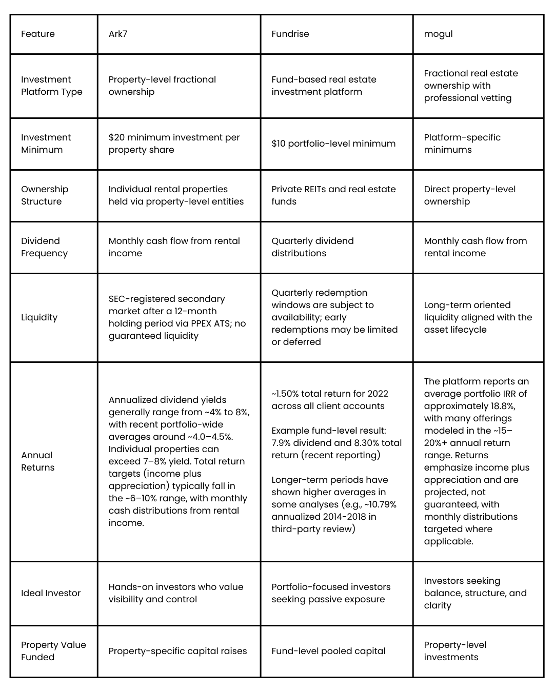 This comparison highlights how each investment platform approaches ownership, income, and liquidity differently. For investors comparing Ark7 vs Fundrise, seeing mogul alongside both platforms clarifies how each fits into a broader real estate investment strategy.