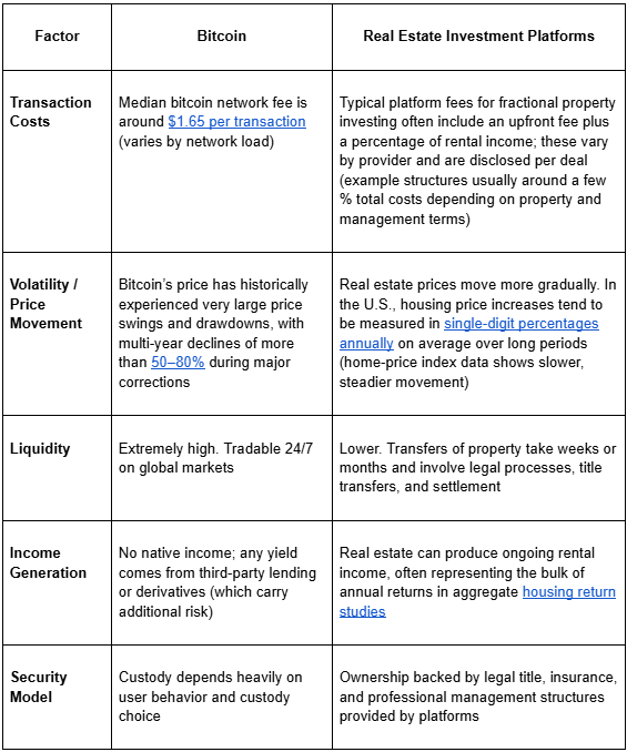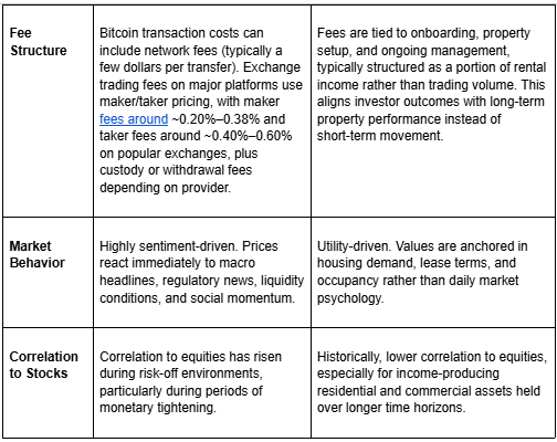 Bitcoin generates returns solely through price appreciation and market demand. Real estate generates returns through rental income and property appreciation over time. This structural difference is why real estate is often viewed as an income-producing asset, while bitcoin is viewed as a growth-oriented one.
